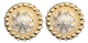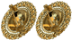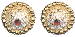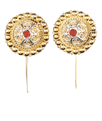 Borenåler i forgylt sølv med kvit filigran og kruse. Med sikerheitsnål på baksida for feste på bunad. Vert leverte som par.