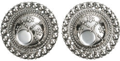 Ansiktssølje i oksidert sølv med runde lauv og korslauv med raud stein.