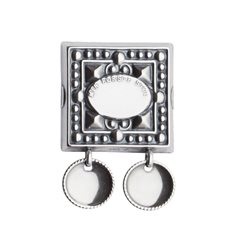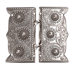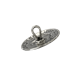 Myntknapp i oksidert sølv. Å laga knappar av sølvmyntar var vanleg før i tida, og denne knappen er ei vidareføring av den gamle tradisjonen. På knappen står det Frid 1111 Dei Grat.